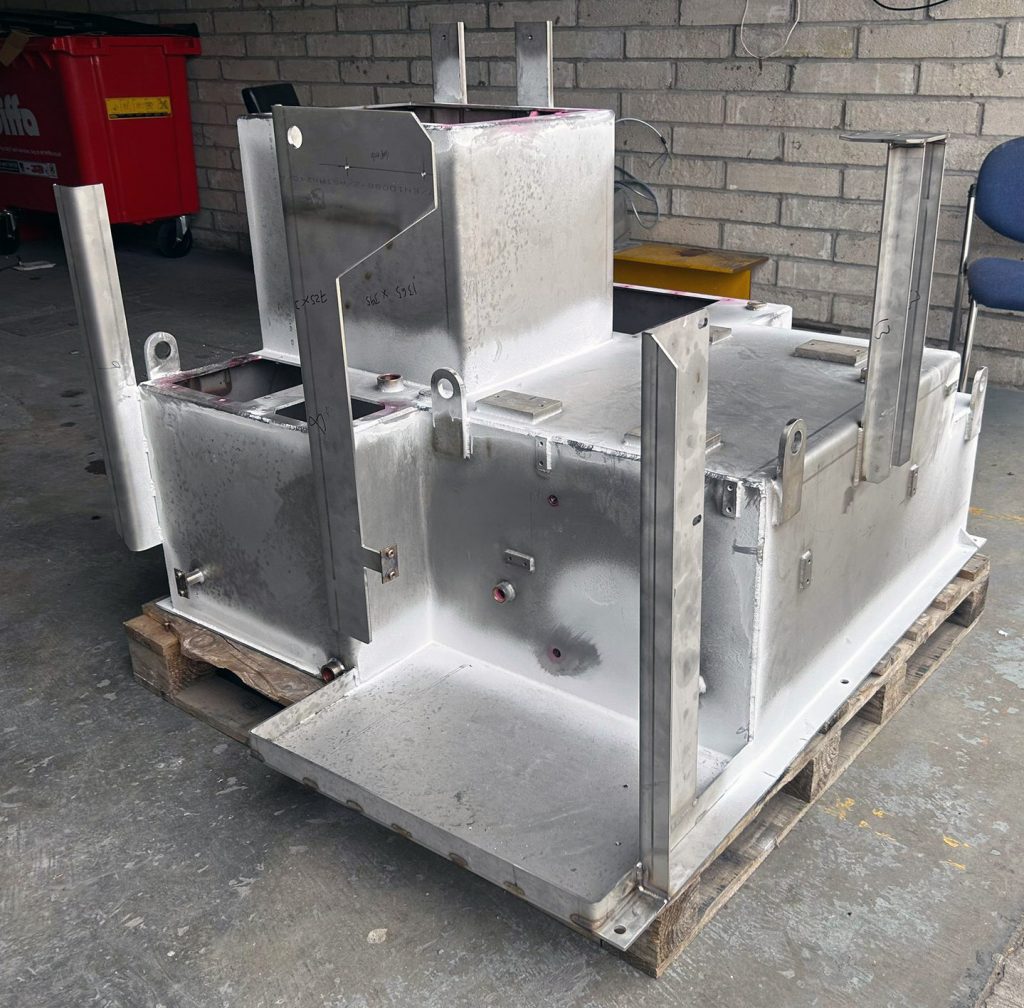 Components were then pressed out with our Amada HFE 100t Press Brake after laser cutting. At this stage, the two-dimensional cut pieces were altered to produce the three-dimensional tank shape: